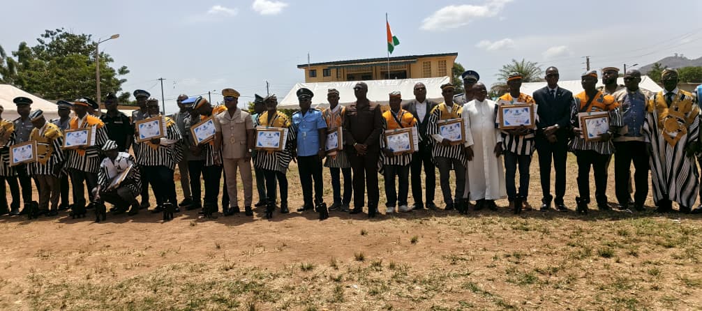 La mise en place des récipiendaires a ensuite donné lieu à une séquence solennelle. Appelés nominativement, les quinze policiers ont reçu un diplôme d’honneur, une statuette de l’éléphant – emblème de la République – ainsi qu’une enveloppe symbolique. Fait marquant, la préfecture de police a également revêtu ses retraités de tenues d’apparat de chef traditionnel Dan, en hommage à l’ancrage culturel de la région et à la dignité de leur parcours. Les flashes des photographes ont immortalisé ces instants de reconnaissance.