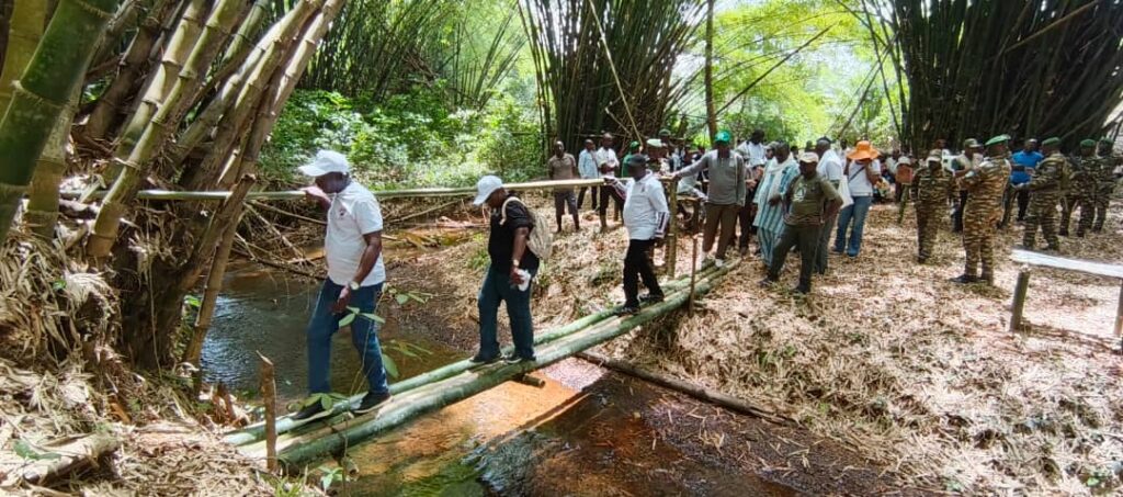 Là, le décor change. Une allée bordée de bambous de Chine offre une ombre apaisante. Des bancs et tables de fortune, confectionnés par les agents de l’OIPR, témoignent d’un sens de l’accueil chaleureux. Le commandant Patrice Gondo, coordonnateur de la brigade mobile de l’OIPR Zone ouest donne les consignes de sécurité. Puis vient la traversée d’un premier cours d’eau sur une passerelle en bambou, suivie d’une progression de près de deux kilomètres dans une forêt dense, vivante, presque mystique. Les cris des touracos et des calaos percent le silence, tandis que la végétation luxuriante enveloppe les visiteurs.